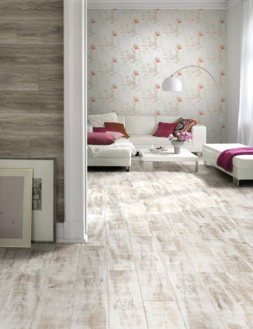 Durable 12mm Dezign Gildas laminate flooring offers a sleek, modern finish with easy installation, perfect for stylish residential interiors.