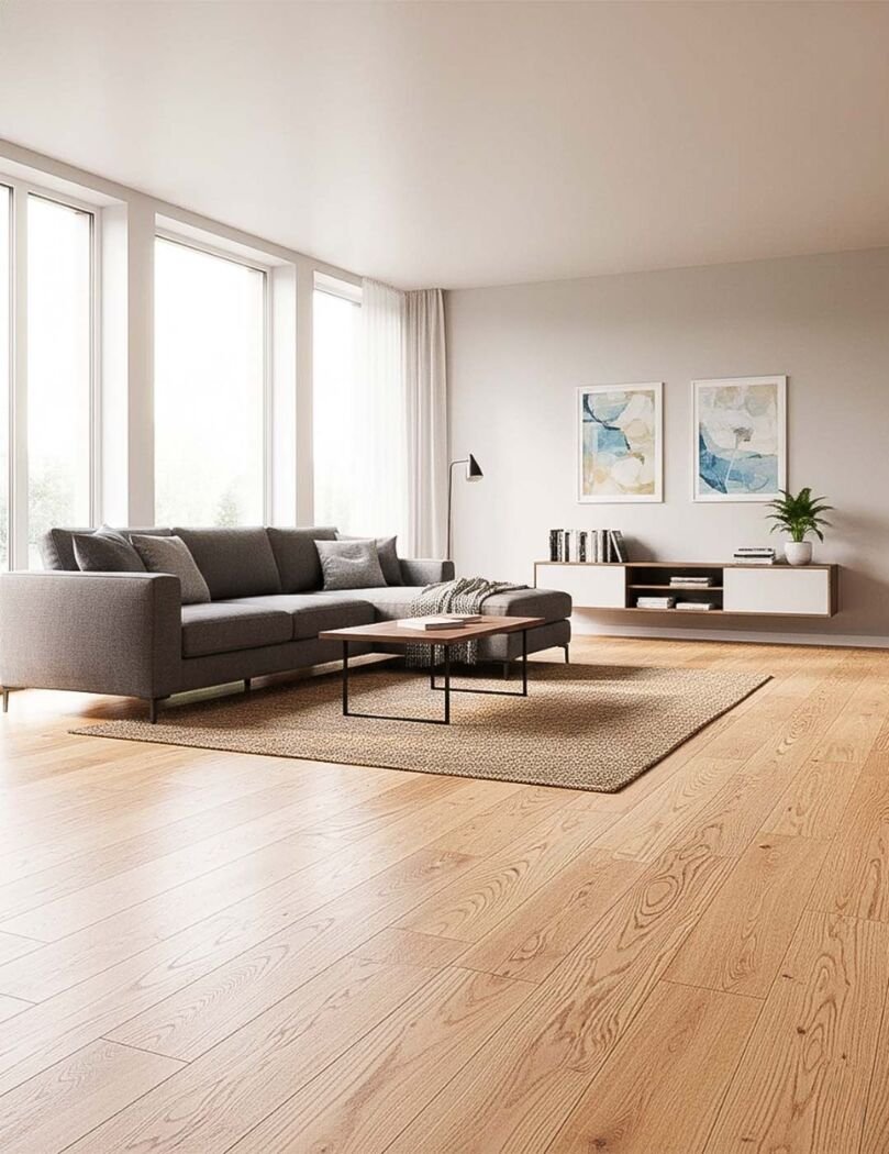 Premium engineered oak flooring with a brushed matt lacquer finish, 125mm wide planks, offering durability, natural beauty, and a timeless look.